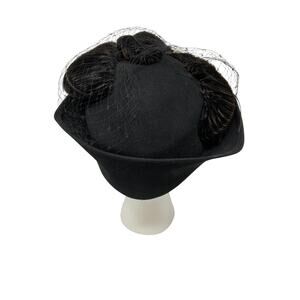 Vintage Karo New York black felt cocktail hat featuring a sculptural rolled crown design with netted veil overlay and elegant faux pearl accent. Classic mid-century fascinator style with structured felt construction and dramatic silhouette, ideal for formal events, vintage fashion lovers, or statement accessorizing. Made by Karo of New York, a known vintage millinery label. Interior label present.