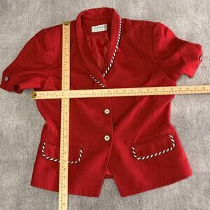 • vibrant vintage red blazer with bold contrast trim, structured shoulders, and a super flattering tailored fit. Perfect pop-of-color piece for preppy, office, or retro looks—easy to dress up and endlessly fun to style