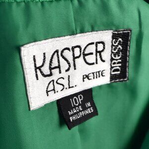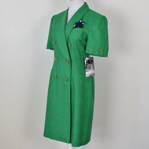 Vintage 80s 90s Kasper ASL Wrap Suit Blazer Dress. PETITE size 10. NEW with tags attached. Bright green with gold colored buttons. Attached navy, green, and white polka dot pocket square. Wrap style. Double breasted button front. Short sleeve. Fully lined. Front pockets. Short sleeve. No shoulder padding. NEW! Vintage! No flaws. 65% polyester 35% viscose rayon dry clean Fast shipping! Measurements laying flat: Shoulders (top shoulder seam to top shoulder seam): 16.5" Bust (armpit to armpit): 19.5" Waist: 16" Hips: 21" Bottom hem width: 22.5" Sleeve length (armpit to cuff): 3.25" Total length (top of shoulder to bottom hem): 37.25" Fall. Spring. Summer. Winter. Business Casual. Career wear. Wear to work. Formal. Party. Wedding. Special Occasion. Cruise. Special event.