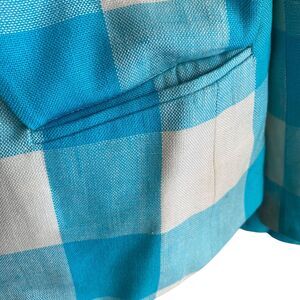 Features a classic tailored blazer with large blue and white check plaid pattern, shoulder pads, three gold-accented blue fabric-covered buttons, two functional front flap pockets, chest welt pocket with foldover detail, and full lining