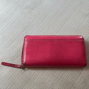 This Kate Spade wallet in a vibrant pink hue is crafted from high-quality pebbled leather. Its sleek design and zip-around closure make it a stylish and practical accessory for any occasion. The wallet has been well loved and has some staining on the back and inside. Small loose threading.
