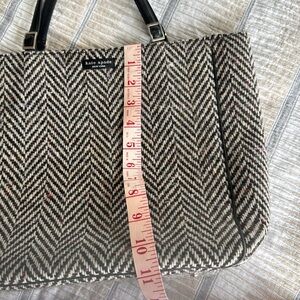 Wool black and ivory with colored flecks herringbone exterior with black leather trim and straps. Purple interior. Very good used condition. Stored in smoke and pet free home.