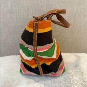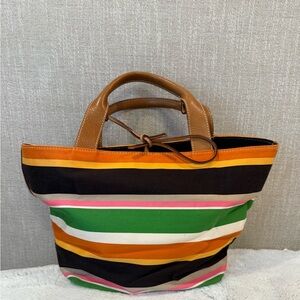 Add a pop of color to your wardrobe with this vintage Kate Spade striped tote. Featuring bold green, pink, orange, and black stripes with tan leather handles, this bag is both playful and chic. The open bucket style with tie closure makes it easy to carry your essentials in style.