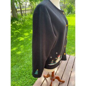 Vintage Katherine Bishop Holiday Fleece Cardigan With Snowman & Tree Embroidery