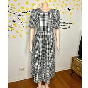 Preowned women’s dress in good condition in a gray and white gingham pattern.