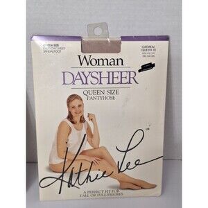 This product is a pair of vintage Kathie Lee full figure pantyhose in size 3XL, featuring an oatmeal color with a sandalfoot design. Made of nylon in the 1990s, these pantyhose are perfect for everyday wear and have a classic eveningwear look. Manufactured in the United States, they are an original piece of women's vintage clothing, catering to plus-size women looking for specialty lingerie items.