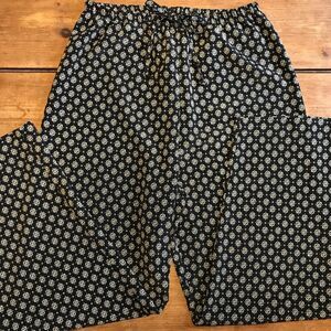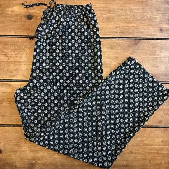 Vintage loose pants by Kathie Lee Collection. Size medium. Black background with a cream and blue design.