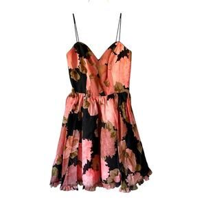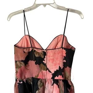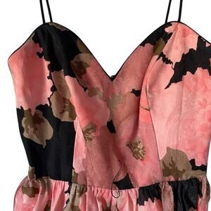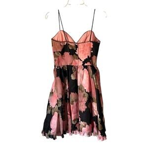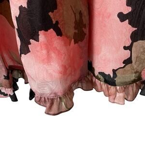 Vintage Kathryn Conover Silk Floral Dress Pink Black Ruffle Trim size 6 in excellent condition with tulle underneath. Loop holes are broken but could be removed. Measurements laying flat chest 17 1/2 inches across and waist 13 1/2 inches across and length 37 1/2 inches long