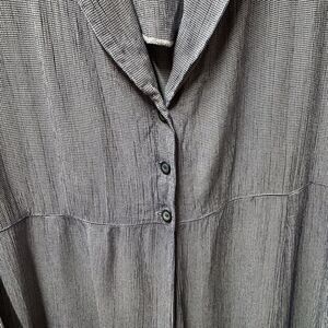 Very nice navy blue and white houndstooth print blouse jacket. Long length with a collar and three button closure. Shoulder pads and 3/4 sleeves.