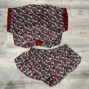 Vintage Kathryn Red Floral Satin Crop Pj Short Set Girly Sexy Feminine Large