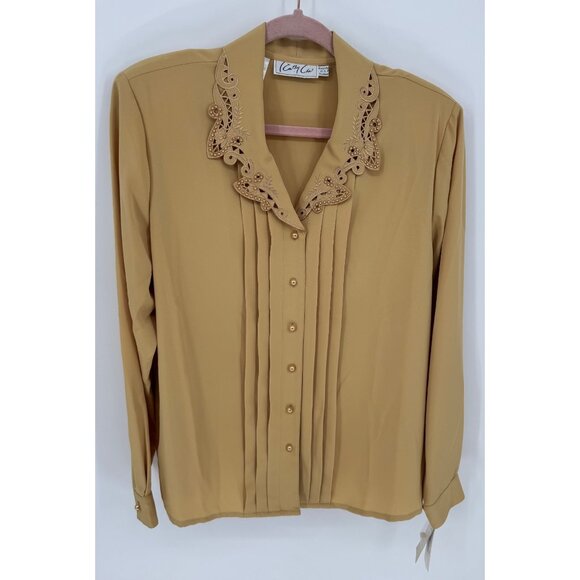 Vintage Kathy Che Beige Pleated Button-Up Blouse With Embroidered Collar Womens