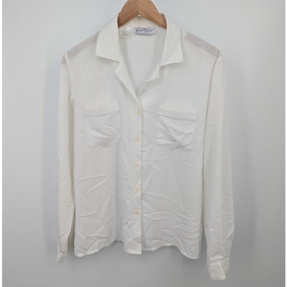 Vintage Kathy Che White Button Front Long Sleeve Blouse Size 14 Semi Sheer Y2k