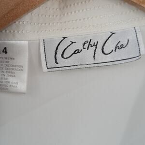 This classic white Cathy Che blouse features a lightweight, semi-sheer finish with textured detailing on the collar and pocket trim. Size 14 (see measurements below). A versatile piece that works for office looks, layering, or casual styling.
