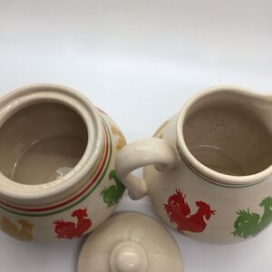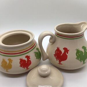 Cute and colorful sugar and creamer set with Lid! From the Kathy Hatch collection, light beige set has yellow red and green roosters. Some crazing, no chips or cracks.