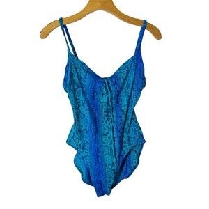 Vintage Kathy Ireland Turquoise One Piece Swim Suit SZ L 12 Royal Blue Paisley