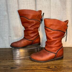 Stay cozy in cold weather with these vintage Kaufman Defrosters shearling boots. Made in Canada, these classic slouch boots feature rich reddish-brown leather, contrasting black piping, and a soft shearling lining that keeps feet warm and comfortable. A back leather tie lets you adjust the fit, while a durable rubber sole provides dependable traction. A timeless retro winter staple that pairs perfectly with jeans, leggings, or casual skirts.