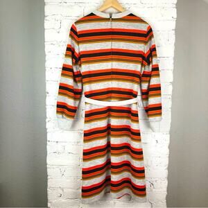 Vintage Kay Windsor Orange Gold Striped Dress. The look you love. Made in USA. Union Made. Tie back or front. In a women’s size Large. Bust approximately 20”,and length 40”.