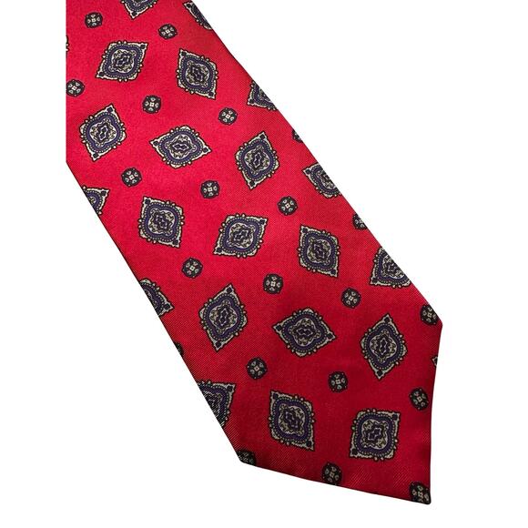This is a handsome, classic deep red tie from Keith Daniels with a purple and blue paisley like pattern on it. All silk and no flaws to note. Cleaned and stored in a smoke free home.