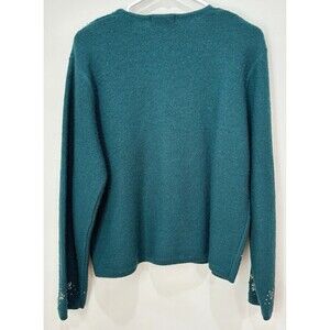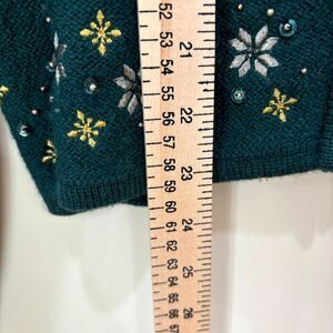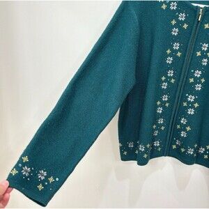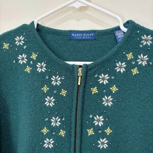 Features: Vintage kelly green cardigan by Karen Scott. 100% pure wool. Full zip front. Snowflakes embroidery in gold and silver. Stunning for the holidays!