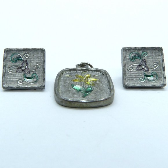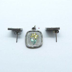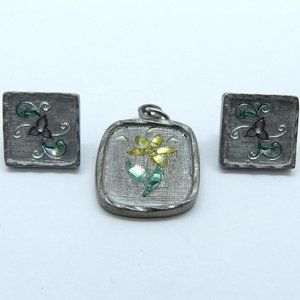 Vintage Kelly Waters Hand Crafted Etched Flower Pewter Pendants & Earring Set