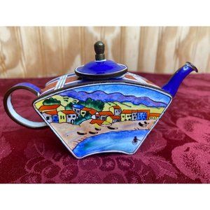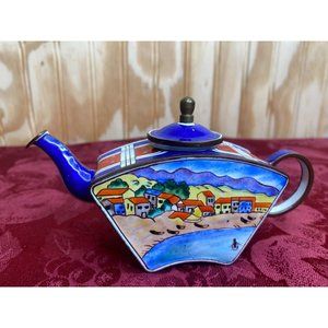 Beautiful vintage Kelvin Chen miniature teapot, featuring a beach coastline scene with blue and red plaid accents. Made from enamel over copper, this unique piece adds a touch of charm to any collection.