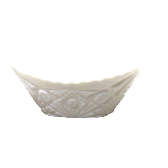 This stunning vintage Kemble Hobstar Milk Glass Relish Candy Dish is a beautiful addition to any home. Crafted in the classic Kemble Hobstar style, the dish has an intricate starburst pattern and fluted edges. The translucent milk glass adds a timeless elegance to the piece. An ideal dish for holding small snacks, it's perfect for any occasion.