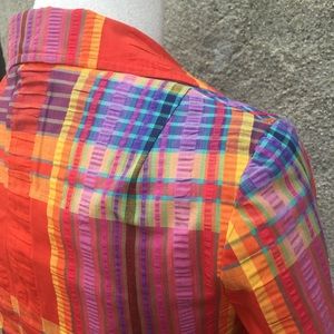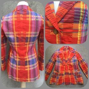 Colorful vintage Kemington Express blazer from the 1970's. Just the buttons alone are valuable! What a great jacket... Love the purples and reds, and the fabric has great texture too. Appreciate how the pattern is sewn symmetrically, from the lapels to the pockets. Measurements: across shoulder 15", bust about 35", length 25", sleeve length 22". Please message with any questions. Thanks!