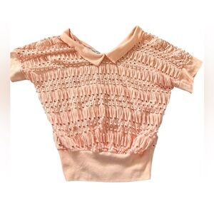 Charming vintage-style smocked knit blouse in a soft peach hue with a Peter Pan collar. Stretchy, open-weave texture with a cropped fit and retro vibes.