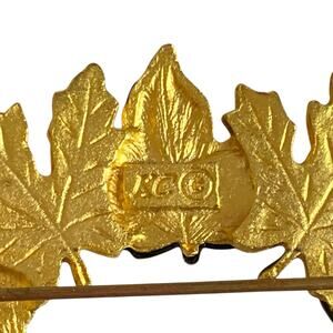 Features: Vintage; signed KC; round wreath shape, autumn leaves gold tone and enamel; delicate; dainty; collector; collection; display; costume jewelry; unique accessory; holiday gift; gift; Halloween; Thanksgiving