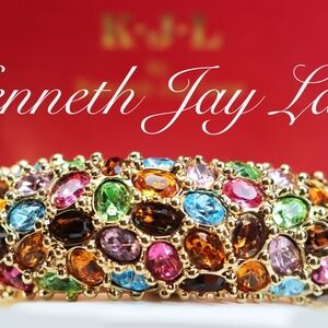 We present one of KJL's most exquisite pieces with detailed prongs forming glimpses of glittering gold against simulated Amber, Citrine, Blue Topaz, Pink Tourmaline & Peridot gemstone cabochons. This piece is extraordinary, opulent and very rare! Upgrade your jewelry box with this mesmerizing bracelet or give this piece as a lavish gift to your favorite Kenneth Jay Lane collector!