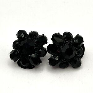 Black Faceted Rhinestone Cluster Clip Earrings: Domed floral style cluster design featuring black rhinestones (jet glass appearance) on blackened metal setting. Measures approximately 1.25 inches. Signed KJL on the reverse.