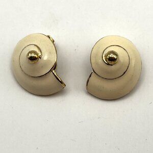 Cream Enamel Spiral Clip Earrings feature a sculptural spiral shell design. Cream enamel over gold tone metal, an elegant and timeless statement look. Measures approximately 1.25 inches (see photos). Signed KJL on the reverse.