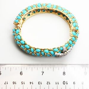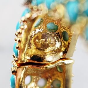 We present one of his most exquisite pieces with detailed prongs forming glimpses of glittering gold against Caribbean blue lacquered cabochons and finished off, like a piece of art, with a bright, dazzling pave crystals encrusted in a silver starfish. This piece is signed KJL, measures 7"L x 7/8"W, weighs 2.1 oz. and has a spring hinge clasp. This bracelet is in excellent vintage condition and would make a beautiful gift for collectors.