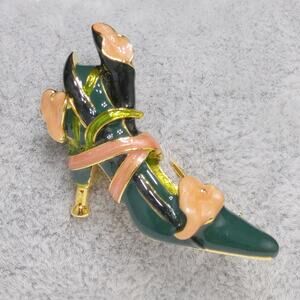 This is a stunning vintage Kenneth Jay Lane (KJL) enamel high heel shoe brooch from the 1990s or earlier. The brooch features a deep green enamel shoe wrapped with a blooming pink lily, accented by touches of green enamel leaves and gold plating. The reflective gold underside and heel add a rich, elegant finish — the surface tested as 10K gold metal. A beautiful example of KJL’s signature bold design and attention to detail, this whimsical yet luxurious piece captures the charm and glamour of vintage fashion jewelry. The brooch is stamped KJL and China on the back. It would make a wonderful gift or a standout addition to any vintage jewelry collection.
