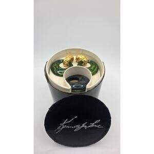 Elegant and collectible Kenneth Jay Lane (KJL) interchangeable hoop earrings set featuring gold-tone textured clip-ons and multiple colorful rings that can be swapped for different looks. Includes original signature KJL packaging — a true statement piece for vintage jewelry lovers.
