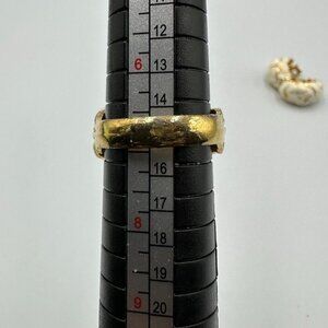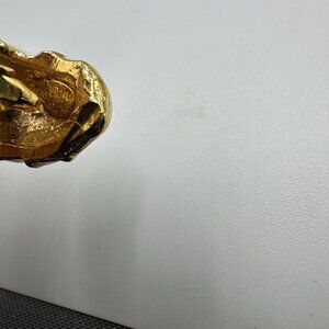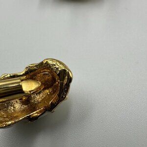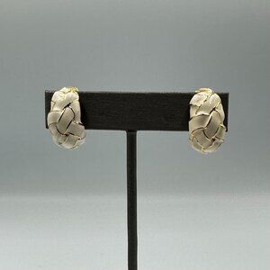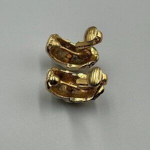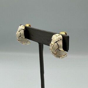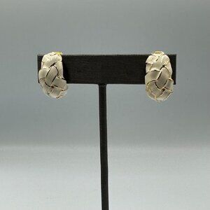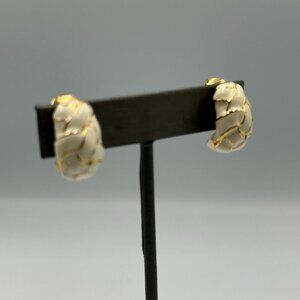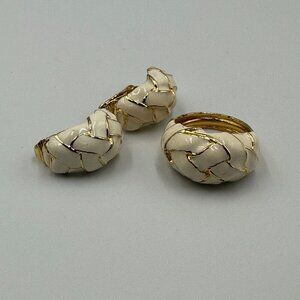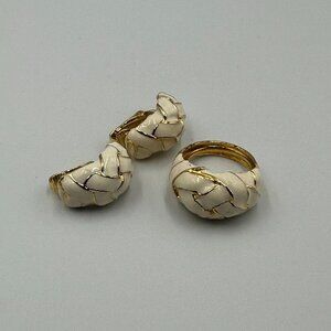• Gold-tone, cream enamel ring + matching clip-on earrings. Minor surface scratches and expected wear from storage/use. Ring shows wear on inner band; earrings have black staining inside backs which could not be removed.