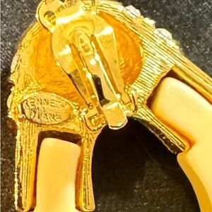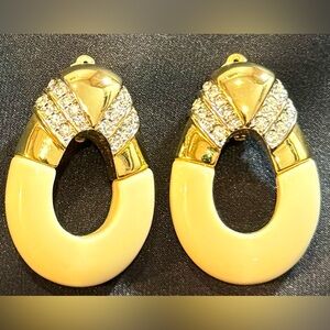 Vintage Kenneth Lane signed clip-on earrings featuring a bold ivory/cream enamel (or resin) oval hoop design with gold tone hardware and sparkling pavé crystal accents. Glam statement look—classic designer costume jewelry that dresses up instantly.