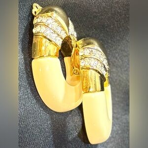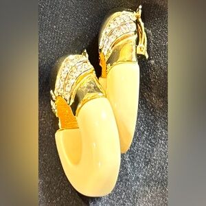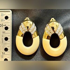 Vintage Kenneth Lane Ivory Enamel Oval Hoop Clip Earrings Pave Crystal Gold Tone