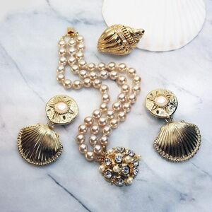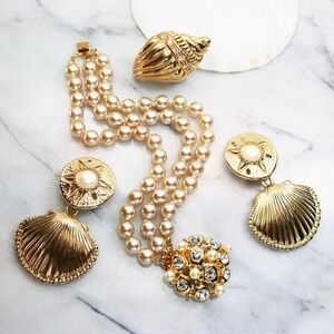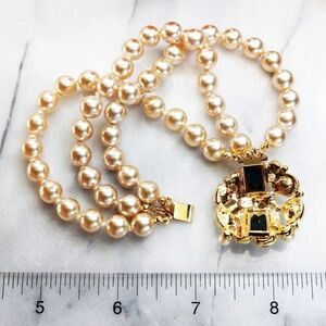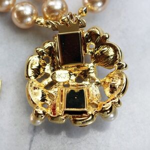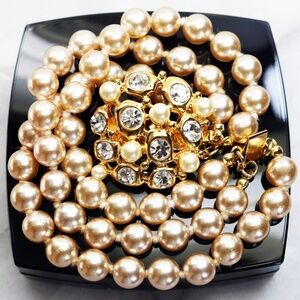 A unique triple strand simulated pearl bracelet with an opulent, stunning, crystal encrusted, pearl cabochon clasp. This piece measures 7.5”L x 1.25”W with an interlocking clasp which is in excellent condition. This piece is signed KJL and it is in good vintage condition with light wear on the pearls (priced accordingly). Not at all noticeable and sure to delight!. All reasonable offers accepted. Be sure to take a look around at all the Kenneth Lane jewelry available in our closet. Happy Poshing