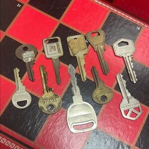 A unique collection of vintage keys in various shapes and sizes. Features metallic tones. 10 keys in total. Sold as is see photos