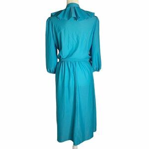 Vintage Key Hole Ruffle Midi Dress M Blue 3/4 Balloon Sleeve Belt Union Made
