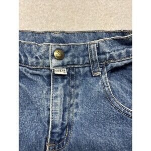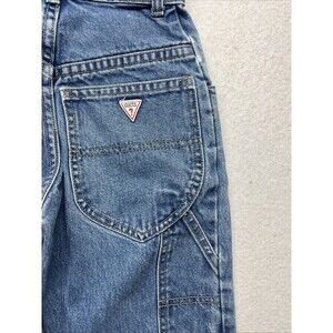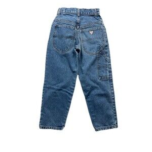 The product is a pair of vintage Guess denim jeans in size 6 for girls aged 6 years. These 80's baby jeans feature a high rise and tapered fit, with a classic blue color and dark wash. Made from cotton denim fabric, they have a zip and snap closure. The jeans are adorned with a USA, 80s, and 90s theme, and are made in Mexico. Perfect for adding a touch of retro flair to any young girl's wardrobe, these Guess jeans offer both style and comfort for everyday wear.