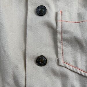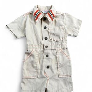 This cream and red jumpsuit from Healthtex combines comfort and style with its soft fabric and vibrant contrast stitching. Ideal for active days, it offers a relaxed fit and a trendy look. Guessing from the 1970s.