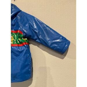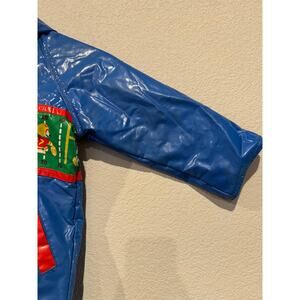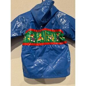Bring on the puddles and playtime! This adorable vintage-style blue rain jacket is perfect for your little one's next rainy-day adventure. Featuring a fun farm-themed print with bright red accents, it's both eye-catching and functional.