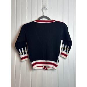 This retro-inspired vintage kids' cardigan sweater features bold graphics, including musical keys, hearts, and text such as "Key to My Heart" and "True Forever." With its black base color, red and white striped trim, and gold-tone buttons, this sweater is a standout piece full of personality.