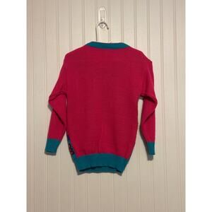 Celebrate nostalgia with this adorable vintage kids' sweater featuring Mickey and Minnie Mouse. Vibrant pink base with teal cuffs, hem, and neckline. The front showcases the iconic Disney couple surrounded by purple hearts and bold "Mickey + Minnie" text.