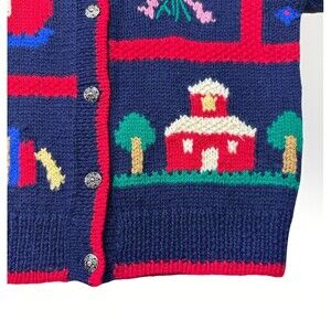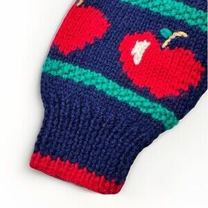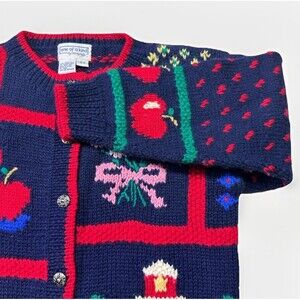 Adorable vintage childrens wool cardigan by One of a Kind by Shirley Lee. Crafted from 100% virgin wool, this cozy knit features a playful folk-inspired design with apples, flowers, and hearts in bright colors against a navy base. Finished with cute silver-tone buttons for that timeless handmade look.