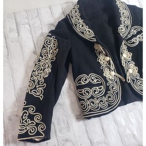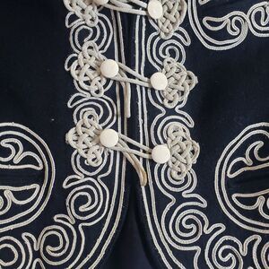 This is a vintage Mexican charro wool jacket featuring beautiful embroidery and in excellent condition. It has lining in the sleeves and interior, two small front pockets, and six buttons for closure. A tiny blemish is present on the button string but remains almost unnoticeable. Apart from that, there are no other blemishes or holes. Has been cleaned and is ready for a child to adore.