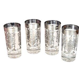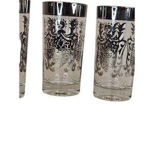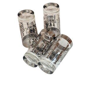 Mid-century modern barware set of 4 vintage Kimiko highball glasses, featuring a silver rim and guardian shield design. Clear glasses with a silver coat of arms, each glass measures 5.5" tall x 2.75" wide.
