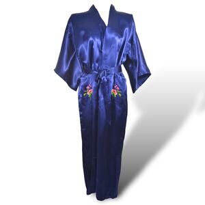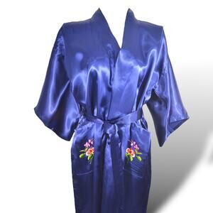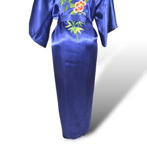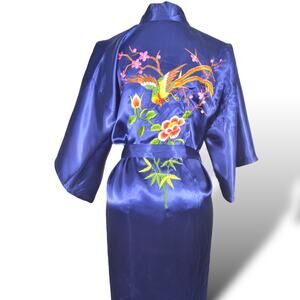 Vintage Kimono Blue Satin Embroidered Boho Floral Bird Swim Cover Gown Robe
